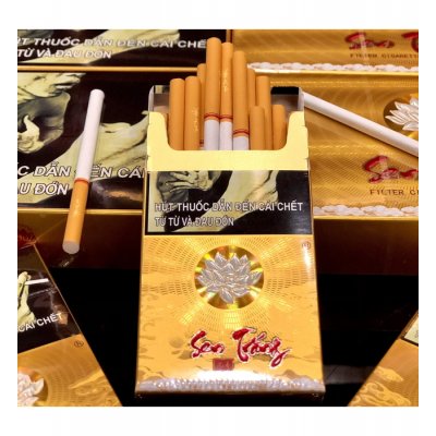 Hộp giấy cứng hoặc hộp sắt sang trọng. Thiết kế tối giản, thường có họa tiết hoa sen và trầm hương. Mỗi hộp chứa 10-20 điếu thuốc, tùy loại.